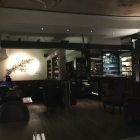 Es gibt hier Bänke mit rotem Lederimitat , dunkle Tische und Stühle dazu. Es ist etwas beleuchtet durch stylische Lampen aber doch ist es irgendwie etwas Finster.