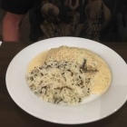 Die Kalamari Tuben waren eingeschnitten das sie aussahen wie ein Blumenkelch. Etwas Backteig gab es drauf und wir denken mal das sie dann frittiert wurden. Der Backteig schön knusprig, die Kalamari aber noch zart und saftig. Geschmacklich hätte es wegen uns noch ein bisschen mehr würze sein dürfen, aber das ist halt Geschmackssache. Genauso wie wir noch etwas Zitrone zum drüber träufeln schön gefunden hätten. Der Reis sehr schön locker und auf den Punkt gegart. Etwas Wildreis wurde noch mit untermengt. Er hat auch beim kochen Gewürze abbekommen und er schmeckte uns. Hier gab es noch Gemüse wie Zuchini, Paprika und Gelberüben mit dazu. Alles schön frisch und auf den Punkt gegart. Etwas Salz fehlte uns hier.