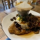 Es handelte sich um ein Schweineschnitzel mit Röstzwiebeln, Champignons, Spiegelei und Bratenjus.