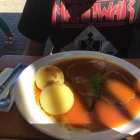 Beim Rinderbraten gab es zwei Scheiben und eine kleinere Scheibe zartes saftiges Fleisch auf dem Teller. Man konnte es fast ohne Messer zerteilen. Geschmacklich gab es auch nichts zu meckern und die Soße dazu hatte einen schönen kräftigen würzigen Geschmack. Sehr lecker. Der Kloß war mit Brotkern gefüllt und oben drauf gab es Bröselschmelze. Er schmeckte dezent nach Kartoffeln und für uns war er sehr weich, mögen wir nicht so gerne. Auch fehlte uns die Struktur das man noch was von den Kartoffeln erkennen kann.
