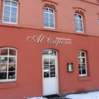 Ich stieg die Treppe hinauf und landete im Bistro. Dort gibt es sechs Bistrotische mit Gusseisengestellen und Resopalplatten, auf denen die Hälfte alte Schwarz-Weiß Fotos, die andere Hälfte alte Zeitungsseiten als Motiv hatten. Dazu gehörten jeweils vier Stühle aus dunklem Holz. Der Fußboden ist ockerfarbig gefliest, die Wände direkt auf die Steine hellocker gestrichen. An den Wänden gibt es einige zweiflammige Wandlämpchen und eine großformatige Reproduktion einer alten Schwarz-Weiß Fotografie an der Stirnseite des Raumes. Außer mir waren keine anderen Gäste in dem sehr kühlen Lokal.