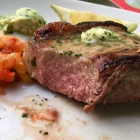 Der Anschnitt ist saftig und zart, das Fleisch zartrosa. Doch je weiter sie in Richtung Fettrand schneidet, desto zäher und sehniger wird das Fleisch. Die Steaksauce – ungefähr ein Eßlöffel voll – besteht aus einer Mischung von Zwiebeln und Tomaten mit etwas Essig abgeschmeckt. Nachwürzen hilft hier bei der Geschmacksverbesserung. Auch die Kräuterbutter kann eine ordentliche Prise Salz und Pfeffer vertragen. Die Pommes frites werden erfreulicherweise separat in einem Schälchen serviert, sehen hausgemacht aus und sind kross und nicht fettig.