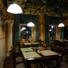 Auf einem Holzdielenfußboden steht Mobiliar aus dunklem Holz, die Stühle mit Sitzpolstern in Grüntönen. Die Tische hatten keine Tischdecken, es gab verschiedenfarbige Platzsets aus Kunststoff, auf denen jeweils Besteck und Papierservietten lagen. Außerdem waren auf jedem Tisch Salz- und Pfefferstreuer, Bierdeckel und ein Teelicht im Glas zu finden. Die Wände sind mit cremefarbenen Holzpaneelen verkleidet, die Decke ist mit einem weißen Raster abgehängt, daran hängen Lampen mit weißen Kunststoffschirmen. Mitten im Gastraum steht ein „Olivenbaum“, am Tresen in blassem Orange stehen zwei Säulennachbildungen, ansonsten halten sich die griechischen Devotionalien in Grenzen.