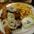 Der Salat war verzehrt, der Teller abgeräumt, kurz darauf brachte mir der Chef den Teller mit dem Hauptgang. Das Arrangement wie üblich, auf einem „Bett“ aus Gyros lagen der Souflaki-Spieß und das Hacksteak, daneben ein Häufchen Pommes frites und ein Klecks Zaziki auf einem Salatblatt. Das Fleisch auf dem Spieß war hervorragend mariniert, so zart und saftig habe ich es noch selten gegessen. Das Hacksteak war schön locker, gut gewürzt mit deutlicher Knoblauchnote, das Gyros ebenfalls sehr gut gewürzt und mit schöner Grillkruste. Die Pommes frites waren frisch, heiß und knusprig, das Zaziki schön mit Kräutern gewürzt, hier war der Knoblauch etwas zurückhaltender eingesetzt. Insgesamt sehr leckeres Essen, die Portion wirkte eigentlich nicht übermäßig groß, aber ich habe sie nicht ganz aufessen können.