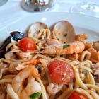 Die Calamari waren offenbar der Renner des Abends; immer wieder wurden sie bestellt, under anderem am Tisch neben uns, den sich zwei chinesische Familien mit je zwei Kindern (von dem erst vor wenigen Tagen in der Volksrepublik China aufgehoben "Maximal Ein Kind-Erlass" waren sie wohl nicht betroffen gewesen) teilten, wurden die Kopffüßler fünfmal bestellt! Sie schmeckten auch sehr gut und mein Schatz war ganz glücklich darüber, auf dem Teller nicht nur Körper sprich Tuben sondern auch die kleinen Füßlein, die sie besonders mag, vorzufinden. Auf der Rechnung werden die Calamari als "gegrillte" ausgewiesen; da sie paniert waren, glaube ich eher, dass sie frrittiert und nicht gegrillt waren. Als häufiger Calamari- oder Calamaretti-Vertilger habe ich es nich nie anders erlebt als dass die Tierlein unpaniert auf den Grill kommen. Hat jemand andere Erfahrungen? Dann flugs heraus damit. Die Spaghetti alio olio waren so wie sie sein sollen: einfach köstlich! Meine Beilagensalat habe ich, man wird es sich fast denken können, gerne an meinen Schatz weitergegeben.