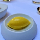 Zum Start hatte ich vegetarisch gewählt, da die Kombi Waldpilze und Dijonsenf kräftiges Umami versprach. Am Gaumen blieben die kleinen, feinen Pilze zunächst sehr zurückhaltend und ließen den vielen frischen Kräutern Raum. Der Senf war dagegen sehr dominant zu einer halbfesten Halbkugel verarbeitet worden, deren feuchte Oberfläche mit dem Löffel schwer zu teilen war. Slippery little sucker… Vielleicht wurden Happen zu groß und dadurch im Zusammenspiel zu intensiv?