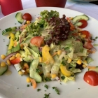 Das Brot, eher Baguette, war frisch und knusprig, vermutlich etwas aufgebacken vor dem servieren, die Remoulade hatte ein süße Säure, die an eingemachte Gurken erinnerte, die könnte selbstgemacht sein. Damit ließ sich die Wartezeit bis zum Essen überbrücken. Und das die Küche sich Zeit nimmt für ihre Arbeit, dass ließ sich auch daraus schließen, das wir 40 Minuten warten mussten. Der Besucherandrang war groß an diesem Donnerstagabend, aber nicht daraus resultierte die Wartezeit, wie ich im Gespräch mit dem Service erfuhr, sondern alles wird frisch gemacht. Fein, dass mögen wir so! Dann aber kam der Beilagensalat zum Gericht meiner Frau.