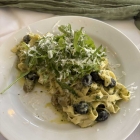 Die Dorade perfekt gegrillter, sehr saftiger Fisch. Garniert mit frischem Rucola an klarer Vinaigrette aus kleingewürfelten violetten Zwiebeln und Heu von Roten Beeten. Trotz riesiger Portion, hab sie Rumpf und stumpf vertilgt, einfach köstlich.