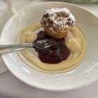 Was da serviert wurde war schon eine optische Verführung. Ein Küchlein mit reichlich Äpfeln darin auf roter Grütze mit Vanillesauce. Ein köstliches Dessert.