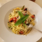 · 1x Bärlauch Linguine mit Spargelrauten, geschmolzenen Tomaten, frisch gehobelten Parmesan und kleinen Salat für 21,00 €