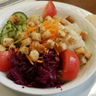 Innen das zarte Fischfleisch schön saftig. Dazu ordentlich gebräunte Bratkartoffeln, zu unserem persönlichen Glück mit nur wenig Speck. Auch die kleine Salatgarnitur mit marinierten Rohkostsalaten knackig und frisch.