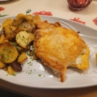 Töchterchen hatte sich für das Schollenfilet Roter Sand entschieden. Zwei Schollenfilets, welche mit reichlich Räucherlachs gefüllt waren, wurden übereinandergelegt, und zusätzlich mit einem Eimantel überbacken. Geschmacklich war das mal was ganz anderes. Schon der deftige Geschmack der Scholle mit dem Räucherlachs war gewöhnungsbedürftig, aber nicht schlecht.