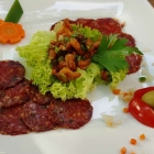 Nicht erwartet hatte ich, dass die Feigen in der Wildschweinsalami verarbeitet wurden. Ebenso der grüne Pfeffer. Auf den Teller kam eine für mich wirklich neue und tolle würzig-fruchtige Salami –ganz klasse!