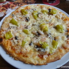 Nach einer angemessenen Wartezeit brachte die Bedienung dann meine Pizza. Auf einem erkennbar handgeformtem, nicht zu dünnen Boden mit knusprigem Rand gab es einen reichlichen Belag aus den genannten Komponenten, dazu auch nicht wenig Käse. Der Anschnitt war locker, der Geschmack sehr gut, die Größe der Pizza für ein Mittagessen mehr als ausreichend.