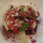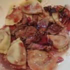 Besonders ärgerlich: Dieses Gericht schmeckte so vorzüglich - es hätte ruhig eine vollständige Portion sein dürfen! Die Ravioli sehr fein, das Fleisch zart und innen medium rare. Wunderbar. Die Reduktion schön abgeschmeckt, Nelke gut zu erkennen.