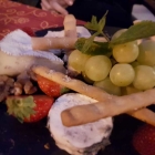 Hübsch angerichtet. Nussbrot hat geschmeckt. Nicht falsch, aber arg konventionell die Begleitung durch Weintrauben, Walnüsse, Grissini und fürs Auge Erdbeeren.