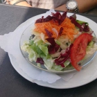 Der Beilagensalat von meinem Schatz wurde recht schnell serviert, verschiedene Blattsalate, Krautsalat, frisch geriebene Möhren und Tomate waren auf dem Teller. Das weiße Dressing war ok, leicht süßlich, vermutlich Convenience, aber für meinen Geschmack zu viel, Schatz hat es aber geschmeckt.