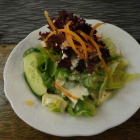 Damit war die Essenseite klar, zu trinken bestellte Madame ein Mineralwasser (0,2l für 1,90 €), ich ein Hefeweißbier (0,5l für 3,20 €). Die Bedienung bedankte sich und verschwand im Hintergrund, um dann nach wenigen Minuten die Salate zu servieren. Verschiedene Blattsalate, dazu einige Möhrenstreifen und Gurkenscheiben waren mit einem gut abgeschmeckten Joghurtdressing kombiniert.