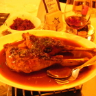 Ich hatte eigentlich sehr mit dem "Hirschsteak Baden-Baden mit Pfifferlingen, Preiselbeerbirne, Spätzle und Feldsalat" (EUR 18,90) geliebäugelt, entschied mich dann aber doch für das Special Offer "Solange der Vorrat reicht: Gänsekeule mit Rotkraut und Kartoffelklößen; 1 Keule EUR 13,90, 2 Keulen EUR 18,90). Klar, dass sich der König der Tiere für die Zwei-Keulen- Variante entschied; dies sollte er auch nicht bereuen. Das Gericht kam, nachdem zuvor ein kleinerer Rechaud auf unserem Tisch aufgebaut worden war. Die zwei Keulen lagen in einer leicht sämige Soße; sowohl das Rotkraut wie auch die beiden mit Semmelbröseln bestreuten Klöße kamen separat. Die erste Keule am Knochenende gepackt und aufrecht auf den Teller gestellt; zum Schneiden wurde das Messer eher nicht benötigt. Das Gänsefleisch liess sich vielmehr ohne jede Mühe ganz leicht vom Knochen abstreifen; es war ausgezeichnet gegart, butterzart und sehr schmackhaft. Ebenso die Klöße und die sicher oftmals einreduzierte Gänsesoße; insgesamt ein absolutes Highlight von einem Gänsegericht! Dass das Rotkraut ein wenig "charakterlos" daherkam ( eine Spur Apfelsaft, ein, zwei Gewürznelkchen und ein Stich Schmalz hätten es sicher aufgewertet); na ja, Jammern auf allerhögschtem Niveau. Wäre das Schnitzel, selbst höchstens eineinhalb Sterne wert, nicht gewesen, hätte ich für "Essen und Trinken" ohne groß überlegen zu müssen fünf Sterne vergeben. Meine Super-Gans im Verbund mit der Hauspasteten-Vospeise, dem Spätburgunder und der Mirabelle retten das Ganze aber letztlich und sorgen dafür, dass ich hier immerhin noch vier Sterne vergeben kann.
