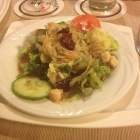 Meine Hauptspeise der Paros-Teller bestand aus: Gyros, Souvlaki, Souzouaki, Pommes frites und Salat. Von der Inhaberin wurde jeder befragt, mit welcher Vinigrette er den Salat haben möchte, ich entschied mich für die klassische Variante mit Öl und Essig. Der Salat wie erahnt, klassisch und rustikal, 1 Gurkenscheibe, 1 Tomatenscheibe, Krautsalat, Zwiebel, eine getrocknete Tomate, geröstete Brotwürfel, grüner Salat und grüner Lollo. Leider ertrankt der Salat in der Vinigrette.