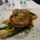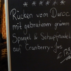 Die Wartezeit auf das Essen gestaltete sich etwas länger, da erst die Essen für die anderen Gäste im Hauptraum herausgebracht wurde. Dann aber kam mein Essen auf einem annähernd quadratischen Teller mit der bekannten Wellenform. Auf einem Bett von Spargelstücken und Schupfnudeln lag ein mächtiges Stück Schweinerücken von ca. 3,5 cm Dicke, mit frisch gemahlenem Pfeffer bestreut. Daneben gab es noch eine Kugel Kräuterbutter, aber, wie ich erst im Nachhinein festgestellt habe, das Cranberry-Jus fehlte. Aber das was auf dem Teller war, war praktisch perfekt: Der Spargel knackig mit Biss und geschmackvoll, die Schupfnudeln ordentlich angeschmälzt. Der Schweinerücken selber war ein Gedicht, zart und voller Geschmack, wie ich es schon lange nicht mehr gegessen habe. Sehr lecker und sehr empfehlenswert!