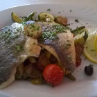 Meine Hauptspeise kam von der Tagesempfehlung: Ich entschied mich nämlich nach meiner Frage, ob Frischfisch und einem Ja für Filet von der Dorade auf mediterranem Gemüse. Zwei schöne Filets lagen mit der Haut nach oben auf dem unterschiedlichsten Gemüse. Ein paar Kartoffelstücke waren auch dabei. Das Gemüse perfekt gegart und hervorragend abgeschmeckt. Diverse Kräuter und ein paar Rosmarinzweige sorgten mit dem Sud für einen sehr guten Geschmack. Die Filets waren perfekt. Die Haut leicht knusprig. Das Fleisch noch schön glasig. Das Gericht erinnerte mich geschmacklich sofort an unsere letzten Urlaube in unserem Hotel an der italienischen Adria, in dem gekocht wird von Mamma. Dies Lob gab ich dann auch an die vermeintliche Chefin weiter, als sie beim Abräumen nach meiner Zufriedenheit fragte. Die Portion war ausreichend und leicht verdaulich. Später standen dafür 19,80 € auf der Rechnung.