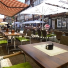 Da ich nur draußen gesessen habe, kann ich zur Einrichtung des Restaurants natürlich nichts sagen. Das Mobiliar draußen ist jedenfalls stabil, mit Metallgestellen und Sitzflächen und Rückenlehnen der Stühle aus braunem Kunststoffgeflecht.