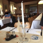 Außen rum geht eine Eckbank und davor befinden sich Tische und Stühle. Die Sitzbezüge tragen einen neueren Stoff, Bilder zieren die Wände und in den Fensterbänken gibt es Blumenstöcke.
