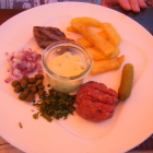 Ich hatte beim letzten Besuch (2019; siehe Bericht) "Tartar Frites mit Garnitur zum selber anmachen, Eigelb und Remoulade" für EUR 16,90 bestellt gehabt (der aktuelle Preis beträgt EUR 21,50). Damals war ich so richtig angefressen gewesen, weil das Fleisch nicht geschnitten sondern gewolft gewesen war; ausserdem war die sogenannte Garnitur sehr spärlich und das avisierte Eigelb hatte durch völlige Abwesenheit geglänzt. Soweit ich noch weiss war meine Frau mit den damals von ihr bestellten Schweinebäckchen sehr zufrieden gewesen. Heute bestellte sie als Vorspeise "Paté Delisoeurs, eine traditionell handwerkliche Paté, hergestellt von den Jacob-Schwestern (nicht zu verwechseln mit den sächsischen schlagerträllernden Jacob-Sisters) in Homburg, und Rohkostsalat" (EUR 10,50) und als Hauptgericht hatte mein Schatz das "Daarler Trio mit Rindfleischsalat, Eiersalat und Lyonersalat mit Röstkartoffeln" für EUR 18,50. Sowohl an der Vorspeise wie auch am Hauptgericht hatte er nichts auszusetzen; mir wären die Röstkartoffeln ein bisschen zu lange und zu heftig geröstet worden.