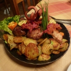 Das Essen wurde dann nach moderater Wartezeit serviert. Auf dem Teller fand ich drei Scheiben Fleisch mit einem Klecks Preiselbeermarmelade darauf, dazu fünf Kroketten und eine schöne Portion Rosenkohl. Das Ganze war umlegt mit einer mittelbraunen, gut abgeschmeckten Sauce. Der Speckrosenkohl hatte diesen Namen wirklich verdient, er war genau richtig gegart und hatte mit dem enthaltenen Speck einen tollen Geschmack. Die Kroketten sahen ziemlich eindeutig nach Convenience aus, waren aber in Ordnung. Das Fleisch war zart und hatte einen feinen Wildgeschmack, die Zusammenstellung war in sich stimmig und sehr lecker.