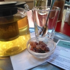 Stattdessen begnügte ich mich als kulinarischer Mannschaftsspieler ganz „Jogi-like“ und mit „högschder“ Konzentration mit einem Kännchen „Team-Spirit“ von Samova (4,90 Euro), einer mit Lemongras, Jatoba (Hülsenfrucht der Hymenaea) und Ginkgo verfeinerten Kräuter-Grüntee-Mischung. Den ließ ich am Platz erst einmal schön in seiner Glaskanne gar ziehen, ehe er mit Kandiszucker gesüßt aus dem kleinen dickwandigen Gläschen genossen wurde. Meine Begleitung hatte es mit einem intensiv zimtwürzig schmeckenden Chai Latte (3,30 Euro) zu tun, was die allgemeine Zufriedenheit über die Warmgetränke am Tisch komplettierte.