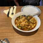 Beim anderen Gericht hieß es sehr scharf und das war auch vorhanden. Einige Chilistückchen taten hier einiges mit dazu. Es kam auch eine schärfe vom Pfeffer mit durch. Es war auch einiges an Soße vertreten die schön würzig / asiatisch abgeschmeckt war. Als Gemüse gab es hier Blumenkohl, Brokkoli, Bohnen , Zwiebeln, Bambussprossen und Gelberüben. Alles frisch und noch mit Biss gegart. Als Fleisch gab es Rind , Schwein und Huhn. Hier auch alles zart und saftig. Dazu gab es noch ein paar Fischstücke , leider haben wir von Fisch zu wenig Kenntnis um zu sagen welcher es war. Er war aber noch saftig. Die Garnelen auch auf den Punkt gekocht.