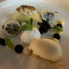 Meringue / Wildheidelbeeren / Frischkäse-Eis waren mit auf dem Teller. Perfekter Hochsommer-Menü Abschluss, es waren auch um 23:00 Uhr immer noch über 30 Grad. Die weiterhin angebotene Menüoption Käse vom Affineur Waltmann mit Stachelbeeren / Mandeln konnte uns an diesem Abend nicht mehr reizen, ein gewisser Herr aus HB möge mir verzeihen.