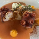 Man weiß es schon, wenn Frau und Herr Carste1972 was mit Artischocken essen können, dann tun sie es auch (auch PetraIO ist schon mitgerissen worden von dieser Leidenschaft). Herzhafte, dicke Aromen in der gebrannten Creme. Leichte Süße durch die Zwiebeln, etwas Schärfe, das harmonierte gut. Es folgte der Fischgang des Abends, sehr mediterran betitelt. Loup de mer mit Sepia, Blattspinat, Oliven, Tomate, beurre blanc.