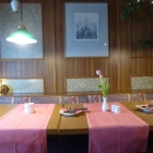 Die Einrichtung ist überwiegend in Eiche rustikal ausgeführt, lediglich die Stühle waren aus dunklerem Holz. Auf den Tischen lagen quer je nach Größe ein oder zwei Tischläufer in blassem Karmesinrot. Darauf jeweils eine Porzellanvase mit einer oder zwei Blüten, ein Windlicht aus der gleichen Serie und Salz- und Pfefferstreuer. Besteck und Servietten waren für je zwei Personen auf Tellern bereit gestellt. Lediglich die Hängelampen über den Tischen waren vom Stil her zu modern und passten nicht ganz zu der übrigen Einrichtung, außerdem produzierten die dort eingesetzten LED-Leuchtmittel, obwohl ziemlich sicher als „Warmweiß“ deklariert, ein schon fast unangenehm helles und auch grelles Licht.