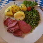 Eine knappe dreiviertel Stunde nach Bestellung kamen mit einem Großaufgebot aller verfügbaren Servicekräfte unsere georderten Hauptspeisen an den Tisch. Der Zarten Lammkeulenbraten gereicht mit Thymianbohnen und Kartoffelklößen kam mit zwei großen und dicken Scheiben Lammbraten daher. Das Fleisch zart mit einem leichten Lammgeschmack. Dazu hausgemachte Kartoffelklöße und knackige Thymianbohnen. Die Soße eine Mischung aus fertiger Bratensoße, jedoch mit dem deutlichen Lammbratengeschmack. Ein kleines Salatblatt mit Cocktailtomate zierte den Tellerrand. Das Schweinerückensteak au four, dazu gebutterte Erbsen und Pommes Frites war ein typisch, ostdeutsches Kneipenessen. Ein dickes, aber butterweiches und zartes Schweinerückensteak, welches mit reichlich Würzfleisch und einer dicken Schicht Käse überbacken war, nahm schon einmal ein Drittel des Tellers in Beschlag. Die beiden anderen Drittel teilten sich die krossen, aber etwas blassen Pommes mit den knackigen Tiefkühl-Buttererbsen. Auch hier wieder ein Blatt Salat und eine Cocktailtomate auf dem Tellerrand. Ein reichliches Essen. Die Forelle Müllerin Art mit Mandelbutter und Petersilienkartoffeln nahm ebenfalls fast die Hälfte des Tellers ein. Die Haut kross gebraten und gut gewürzt, im Inneren war die Forelle butterweich und die Gräten ließen sich wunderbar lösen. Die dazu gereichten Kartoffeln waren ebenfalls weich und mit frischer Petersilie bestreut. Dazu zerlassene Butter und auf dem Tellerrand das obligatorische Grünzeugs. Hier fehlte dem Besteller eine kleine Gemüsebeilage, ansonsten war er sehr zufrieden. Mein Argentinisches Rumpsteak mit Chilibutter, Pommes Frites und Salatbeilage war das Beste am ganzen Tisch. Ein dickes, auf meinen Wunsch Medium Rare gegrilltes Rumpsteak, war der Blickfang auf dem Teller. Dazu krosse und hier etwas braunere Pommes und eine große Salatbeilage aus verschiedenen (Fertig)Salaten und etwas Dressing füllten den Teller reichlich. Ein Röschen Chilibutter lag für das Rumpsteak bereit. Ein eigentlich recht einfaches, aber sooo leckeres Essen. Ich war mit meiner Wahl mehr als zufrieden. Die zwei Teller Gepökelte Rinderzunge mit zerlassener Butter, Erbsen und Petersilienkartoffeln waren identisch. Jeweils sechs dicke Scheiben butterweiche, zarte, gepökelte Rinderzunge lagen auf den Tellern. Dazu auch hier wieder die weich gekochten Kartoffeln sowie die knackigen TK-Buttererbsen. Und natürlich fehlte auch hier der obligatorische Salat auf dem Tellerrand nicht.