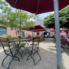 In den letzten Jahren fanden auch hier Erneuerungen und Verschönerungen statt, doch das beeindruckende Ambiente ist geblieben. Der rustikale, urige Bauernhof mit Klinkerfassade beherbergt Café und Restaurant und ist von einem prächtigen, mit Kies ausgelegten Biergarten umgeben. Dort sitzt man sehr kommod auf Holzmöbeln, umgeben von viel Grün. Ich habe das Glück, nach einer langen Regenzeit Anfang Juni gerade zum ersten Frühsommerhoch einzutreffen, das allerdings auch von einer wahren Fahrradfahrerinvasion begleitet wird. Glücklicherweise ist der Service sowohl gut besetzt als auch gut bei Laune und voll auf Draht. Den rheinischen Umgangston muss man allerdings mögen.