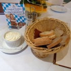 Ein Körbchen mit ein paar dünnen Scheiben vom Baguette und etwas Graubrot, zusammen mit einem Schälchen gewürztem Quark wurde bald auf unseren Tisch gestellt. Der Quark nichts Besonderes, das Brot trocken, die Baguettescheiben zu dünn und mit großem Loch in der Mitte auch schon etwas älter.