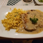 Ich hatte mir das Waidlerschnitzel auserkoren. Aber statt einem saftigen Schweineschnitzel wurde mir hier ein viel zu lange in der Pfanne gebratenes Schweinesteak serviert, denn ohne Panade ist das bei weitem kein Schnitzel. Die Schwammerlsoße sah zwar cremig aus, war mir persönlich aber zu dünn. Auch vermisste ich hier ganz paar Schwammerl, denn die wenigen Pilzstückchen die in der Soße schwammen waren nicht der rede wert. Die hausgemachten Spätzle dagegen waren wieder sehr gut und vor allem reichlich. Sie waren teilweise schön kross angebrutzelt und zum Glück nicht pappig, also so wie ich es mag.
