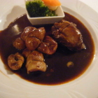Doch nun zum Essen! Vor dem Gruß aus der Küche gab es bereits schmackhaftes und angewärmtes Weißbrot im Körbchen mit einem Schüsselchen Griebenschmalz dazu; der Gruß aus der Küche bestand wie in letzter Zeit immer aus einer Minestrone im Gläschen und einer kleinen Tranche Flammkuchen. Lecker! Als Vorspeise war, nachdem die ganz vorzügliche "Marseiller Fischsuppe" diesmal leider "aus" war, die "Französische Zwiebelsuppe" erste Wahl. Sie war gut, allerdings keine Offenbarung! Als Hauptgericht hatte ich die mir von vorherigen Besuchen in bester Erinnerung gebliebene "Trilogie vom Wild" (Reh, Hirschkalb und Feldhase mit Preisselbeerbirne, Maronen, Spätzle und Salatteller) bestellt. Der Salatteller hat mir nicht geschmeckt; ein sehr einfaltsloses und weitgehend geschmacksfreies Dressing! Die Spätzle (leider aus der Tüte) konnten diesmal nicht überzeugen, das Wild umso mehr. Reh- und Feldhasenfilet (beides im Speckmäntelchen) sowie das Hirschkalb (nackt) waren auf den Punkt gegart, innen rosa gebraten und butterzart; bei der zuvor gegessenen Trilogie war das Hirschkalb so roh gewesen, dass es mir fast noch vom Teller gehopst wäre. Die Maronen, die Preisselbeeren und die Wildsauce passten sehr gut zum Gericht und waren in sich stimmig, ebenso das dazu gereichte kleine Schüsselchen mit Rotkraut und einem Rosenkohlröschen darauf. Insgesamt vergebe ich für den Bereich "Essen" angesichts von Spätzle und Salatteller (das geht beim Hierl" beides auch besser) vier Sterne.