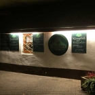Es ist hier ein rustikales Gemäuer, sehr viel mit Holz verkleidet. Außen herum befindet sich eine Eckbank, dazu helle Tische und Stühle. An den Wänden hängen ein paar alte Fotos und an einer Wand gibt es einen aufgemalten Spruch. Man kann das offene Feuer vom Buchenholzgrill sehen und zuschauen wie darauf gegrillt wird.