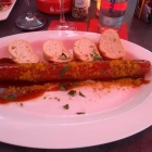 Nach etwa 20 Minuten landeten beide Gerichte zeitgleich auf unserem Tisch. Die Currywurst riesig und der Teller mit dem Ziegenfrischkäse sehr dekorativ.