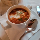 Auch unsere Soljanka-eine süß/säuerliche Suppe mit gebratenen Wurststreifen, Zwiebeln, Paprika und Gewürzgurke, verfeinert mit Sahne und dazu Baguette war mal wieder eine richtige Soljanka. Reichlich Salami- und Jagdwurststücken, dazu frischer Paprika und Zwiebel, sowie saure Gurkenstückchen und dies alles in einer angenehm cremigen, leicht sauren Soße. Obenauf ein Klecks saure Sahne und eine frische Zitrone. Mmmh lecker-so eine Soljanka gab’s schon lange nicht mehr. Allein die Vorsuppen machten uns nun schon neugierig nach den Hauptspeisen. Diese waren, frisch zubereitet, nach knapp 45 Minuten am Tisch.
