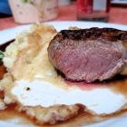 Zwei solcher „Versucherle“ bestritten bei uns das kulinarische Vorprogramm. Meinen Kletterkameraden sprachen dabei die hausgemachten Ravioli mit Salbeibutter und Parmesan (13,80 Euro) am meisten an, während ich mit dem Lammrückenmedaillon in Rosmarinsauce mit Parmesan-Kartoffelstampf (17,80 Euro) an den Start gehen wollte.