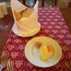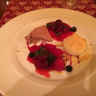 mit Minzkirschen laut Karte. Eine etwas wüste Präsentation auf dem Teller bot sich mir dar. Parfait war da, kosten, gut, nicht zu süß, trotz hellerer Schokolade. Die Kirschen auch, mit frischer Minze obenauf, in der Sauce fand ich kein Minzaroma wieder, dabei ein paar frische Beeren, auch lecker. Überraschung beim Knödel, beim anschneiden erblickte ich das