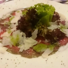 Das hauchdünne Fleisch von sehr guter, fein marmorierter, Qualität. Obenauf ein Salatbouquet und frisch gehobelter Parmesan und frisch gemahlener Pfeffer. Ein feines Pesto mit Basilikum und Knoblauchnote rundet den Geschmack ab.