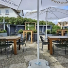 Als die aufziehenden Wolken immer dunkler wurden, empfahl sie dann von sich aus einen Wechsel, sehr nett. Ich wollte zwar „den paar Tropfen“ trotzen, aber sie sollte recht behalten. Der nachfolgende Guss trieb auch die letzten Außengäste an die rustikalen Holztische herein. Später, als mein Essen doch arg lange auf sich warten ließ, ignorierte sie uns nicht etwa, sondern sprach ein paar vertröstende Worte und ging dann selbst in die Küche um nachzuschauen. Rätsels Lösung war die Lieferung für ein Event, was uns eine Entschuldigung und ein (weiteres) Gläschen Champagner (When you‘re in Kampen…) einbrachte.