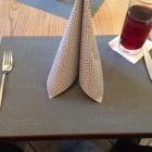 Dann deckt die freundliche Bedienung mit Tischsets aus Silikon, Besteck und schlicht gemusterte Papierservietten auf. Kurz drauf kommt mein Getränk – natürlich doch viel Saft und damit nicht leicht. Noch im Vorbeigehen wird die Lage eines Sets beim Paar an meinem Tisch von der Bedienung nochmals zurecht gerückt – es liegt nicht parallel zu dem Gegenüber.- kleiner Perfektionismus, der auch in der Art vom Abräumen, Abwischen und Eindecken der freiwerdenden Plätze auffällt. Nach angenehmer Wartezeit kommen die Geschlagenen auf einem großen Teller mit einem Soßenspiegel auf den Tisch, dazu der Salatteller.