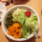 Der Salat der Saison besteht aus Blattsalat, Möhren, Blumenkohl, grünen Bohnen und einem Tomatenachtel.