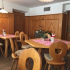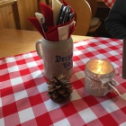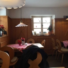 Die Beurteilung hier für den Nebenraum, den Gastraum selber haben wir zu wenig gesehen, sah aber auch irgendwie so aus. Es ist ein altes Gasthaus mit Fliesenboden. Es gibt eine rundum Holzverkleidung aus hellem Holz mit Mustern drin. Tisch und Stühle bestehen auch aus hellem Holz. Auf den Stühlen gibt es helle Stoffkissen und auf den Tischen eine rot-weiß karierte Stoff Mitteldecke. Als Deko drauf gibt ein weihnachtliches Glas mit Teelicht. Das Besteck steht in einem Krug parat und die Servietten sind gefächert in rot und weiß mit drinnen. Es ist keine chi-chi Gaststätte, sondern ein altes bayrisches Gasthaus. Uns hat es gefallen und somit ist es uns 4,5 Sterne wert.